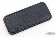 This leather slip sheath by Robertson Leather Works features hand dyed alligator skin. It is 5.5" long by 2.5" wide. New from maker at the 2024 Blade Show Texas.