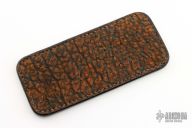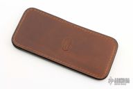 This leather slip sheath by Robertson Leather Works features hand dyed Cognac Giraffe skin. It is 5.5" long by 2.5" wide. New from maker at the 2024 Blade Show Texas.