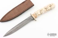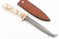 This fighter by William Miller features a spear point Damascus blade with sharpened top edge, .204" blade stock and .887" blade depth, hidden tang construction. The handle has a nickel silver guard, carved stag grip. Comes with a brown leather sheath. Excellent condition.