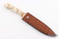 I have been making knives for over 28 years. I make my own Damascus, everything from random patterned to pattern-welded mosaic in my blacksmith shop in Warsaw, Missouri. I make all sorts of knives including hunters, small and large to small swords. I use 1084, 1095 spring steel, 15n20, and L6 tool steel in my Damascus. I prefer to use sambar stag and fossil ivories on the handles with nickel silver for the fixtures.