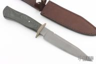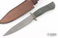 This Fighter by William Miller features a bead blasted blade with false top edge and fileworked spine, .252" blade stock and 1.284" blade depth, hidden tang construction. The handle has a bead blasted nickel silver guard, black canvas micarta grip. Comes with a brown leather sheath. Has some light patina, otherwise excellent condition.