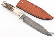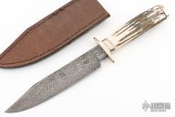 This Bowie by William Miller features a clip point Damascus blade with false top edge, .240" blade stock and 1.301" blade depth, hidden tang construction. The handle has a nickel silver guard and butt with a stag grip. Comes with a brown leather sheath with crocodile skin overlay. Excellent condition.