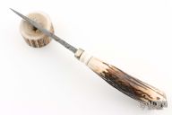 I have been making knives for over 28 years. I make my own Damascus, everything from random patterned to pattern-welded mosaic in my blacksmith shop in Warsaw, Missouri. I make all sorts of knives including hunters, small and large to small swords. I use 1084, 1095 spring steel, 15n20, and L6 tool steel in my Damascus. I prefer to use sambar stag and fossil ivories on the handles with nickel silver for the fixtures.