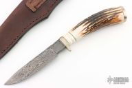 This hunter by William Miller features a Damascus blade with false top edge and fileworked spine, .253" blade stock and .989" blade depth, hidden tang construction. The handle has a nickel silver guard and butt, stag grip and mammoth ivory spacer. Comes with a brown leather sheath. Excellent condition.