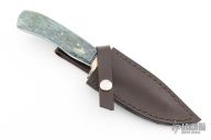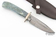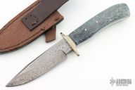 This hunter by William Miller features a Damascus blade with false top edge, .273" blade stock and 1.217" blade depth, hidden/frame tang construction. The handle has a nickel silver guard, stainless steel frame and blue giraffe bone scales. Comes with a black leather sheath. Excellent condition.