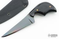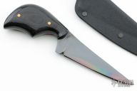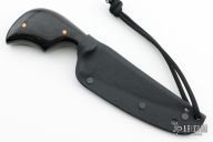 This Expert Neck Knife from Fred Perrin features a gun blued blade with visible temper line and notched thumbrest, .139" blade stock and 1" blade depth. The handle is comprised of black micarta scales with nickel silver pins over full tang construction. Includes kydex sheath. New from maker.