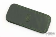 This leather slip sheath by Robertson Leather Works features green oxford leather. It is 4.25" long by 2" wide. New from maker at the 2024 Blade Show Texas.