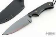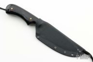 This Utility by Fred Perrin features a black blade with notched thumbrest, visible temper line, .143" blade stock and 1.223" blade depth, full tang construction. The handle is comprised of contoured black linen micarta scales with nickel silver pins and lanyard hole. Includes a kydex sheath. New from maker.