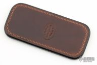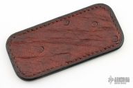 This leather slip sheath by Robertson Leather Works features Dark Cognac Quill Ostrich leather. It is 3.75" long by 1.75" wide. New from maker at the 2024 Blade Show Texas.