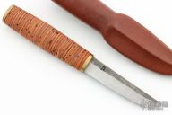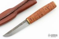 This knife by Martti Malinen features a hand forged blade with .151" blade stock and .740" blade depth, hidden tang construction. The handle has a brass ferrule and butt, stacked birch bark grip. Comes with a brown leather sheath. Excellent condition.