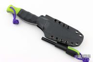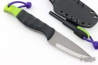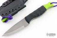 This Bushcrafter by Auxiliary Manufacturing features an acid tumbled blade with scandi grind, .134" blade stock and 1.158" blade depth. The handle has black G-10 scales with black liners and green g10 pommel. Comes with a kydex sheath with clip. New from maker at the 2024 Blade Show Texas!