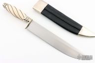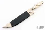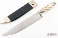 This Searles Bowie by Jim Ence features a hand rub satin finished blade with .192" blade stock and 1.468" blade depth, hidden tang construction. The handle has a nickel silver guard and butt, spiral fluted mammoth ivory grip with twisted silver wire inlays, nickel silver fileworked spacers. Comes with a nickel silver and black leather scabbard. Excellent condition.