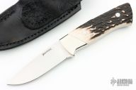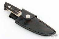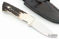 This knife by Buster Warenski features a mirror polished blade with .167" blade stock, 1.067" blade depth, full tapered tang construction. The handle has nickel silver bolsters and stag scales. Comes with a black leather sheath. Has a few very light scratches, otherwise excellent condition.