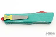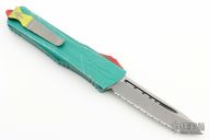 This Combat Troodon by Microtech features an Apocalyptic finished tanto blade with full serrated edge. The handle has a distressed green aluminum frame with red hardware and a tip down stainless steel clip. Comes with original box and papers. Dated 05/2022 and s/n 1948. Excellent condition.