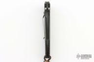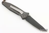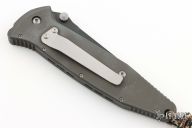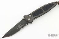 This Socom D/A Auto by Microtech features a black clip point blade with a partially serrated edge. The thumbrest is notched. The handle has a black aluminum frame with non-slip inserts and a tip down stainless steel clip. Dated 5/97 and #383. Comes with a Microtech gold box. Has a couple light scuffs and scratches, excellent condition otherwise.