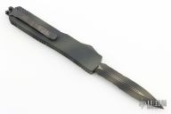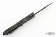 This Makora OTF automatic features a green camo finish double edge partially serrated blade and green camo handle. Bead blast stainless steel clip and glass breaker. Includes original tube, sheath, tool, and paperwork. Dated 11/2003. Has a couple light scuffs, otherwise excellent condition.