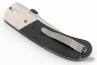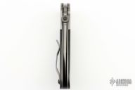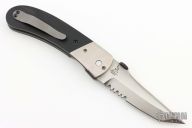 This Retro Predator Backup by Greg Lightfoot features a bead blasted chisel ground clip point tanto blade with partial serrations, notched thumb ramp and a knurled thumb disc. The handle features satin finished titanium bolsters, micarta scales and a titanium tip up pocket clip. Nice action, detent, and blade seating. Comes with a zipper case. Has some light scuffs on the bolsters, excellent condition otherwise.