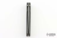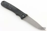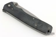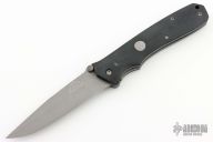 This knife by Butch Vallotton features a bead blasted clip point blade with notched thumbrest and dual thumbstuds. The handle has black micarta scales, bead blasted stainless liners and backspacer. Nice detent, lockup and blade seating. SOF-96 #35 on blade. Comes with zipper case. Blade favors the right side slightly, and has some light scuffs, otherwise excellent condition.