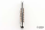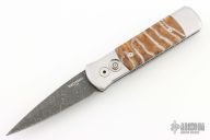 This Godson by Pro-tech features a Chad Nichols Damascus spear point blade with false top edge. The handle has a satin finished stainless steel frame with Mastodon Tooth inlays and satin stainless steel clip. Mosaic inlaid pin in the button. Comes with original box and papers. Has a couple light scuffs and scratches, great condition otherwise.