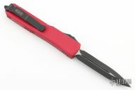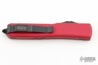 This Ultratech OTF automatic by Microtech Knives features a black D/E blade with a standard edge and a red aluminum handle. Black stainless steel clip and hardware. Glass breaker. S/N 108995 and dated 12/2018. Comes with original box and papers. Has a couple light scuffs otherwise excellent condition.