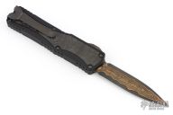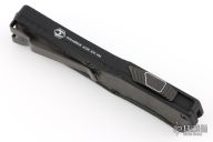 This Colossus by Heretic Knives features a hand ground Baker Forge Damascus double edged blade. The handle has a black aluminum frame with Black Dunes Fat Carbon inlays, DLC stainless steel thumb slide with Black Dunes Fat Carbon inlay, stainless steel tip down clip. Comes with original box, zippered case and COA dated 5/22 and s/n 034. Excellent condition.