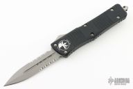 This knife features a D/E bead blasted blade with two partially serrated edges. The handle is black aluminum with a tip down stainless steel clip. #08796 and dated 09/2013. Comes with original box and papers. Excellent condition.