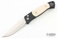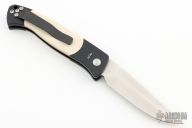 The Brend Auto by Pro-Tech Knives features Walter Brend's famous "Model 1" blade shape in a small package. Coil spring side-opening automatic. It has a satin finished blade and black aluminum handle with ivory micarta inlays, tip up stainless steel clip. Excellent condition. Comes with original box and papers. PR6 #355