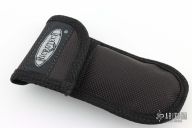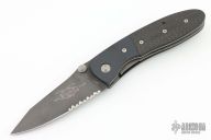 This Lightfoot LCC D/A side opener by Microtech has a black partially serrated blade, black titanium bolsters, and carbon fiber scales. Stainless steel clip and liners. Dated 10/2002 and #8090. Comes with original box, papers, and nylon sheath. Excellent condition.