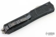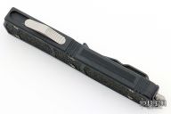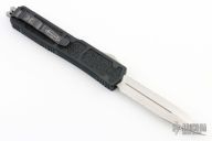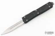This Makora OTF automatic by Microtech features a satin finished partially serrated double edge blade. The handle has a black aluminum frame with nonslip inlays. Black stainless steel clip, tip down carry. Dated 01/2005 and #2383 on clip. Includes the original box, papers, original nylon sheath. Excellent condition.