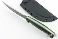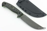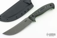 This Tayal by Work Tuff Gear features a Dark Wash finished SK85 blade with notched thumbrest, .153" blade stock and 1.337" blade depth, full tang construction with black/green G-10 scales with green liners. Coems with a kydex sheath and original box. Excellent condition. Dated 09/2023