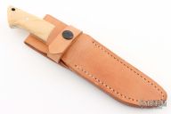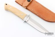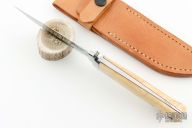 This Loveless Mini-Wilderness by A. Desaulniers features a mirror polished blade with sharpened top edge, .199" blade stock and 1.089" blade depth. The handle is comprised of a stainless steel guard, some kind of horn or ivory scales with red liners, full tapered tang construction. Not exactly sure what the scales are, but there are cracks on both sides. Lanyard tube in pommel. Includes leather sheath and zippered case. Besides the cracks in the handle, it is in excellent condition.