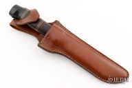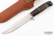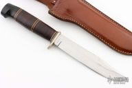 This Morseth Hunter was made pre 1971 by Harry and Steve Morseth. It has a satin finished clip point laminated steel blade with hidden tang, .169" blade stock and 1.034" blade depth. The handle has a nickel silver guard, stacked leather grip, ebony butt, black/white/red spacers. Comes with a brown leather sheath with belt loop. Has some light scratches, otherwise excellent condition.