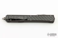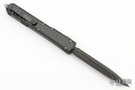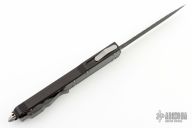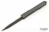This Makora II OTF automatic by Microtech features a black double edge blade with one fully serrated edge. The handle has carbon fiber inserts on both sides of the black aluminum handle. Black coated stainless steel clip, blasted hardware and glass breaker. Dated 08/2009 and serial number 02097. Includes original box, sheath and papers. Excellent condition.