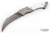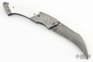 This T-Rex Tactical Folder from Suchat Custom Knives features a Damascus hawkbill style blade with swedge, fileworked thumb rest and single thumb stud with yellow hue stone inset. The handle is comprised of Damascus double bolsters and fluted pearl inlays over fileworked and anodized titanium liners and backspacer. Great blade seating, detent and lock up. Comes with a zipper case. Has some patina and some scuffs, has some bladeplay in open position, excellent condition otherwise.
