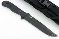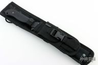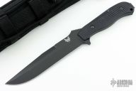 This 155 Osborne Design by Benchmade has a black blade with a sharpened top edge, .183" blade stock and 1.206" blade depth, full tang construction with black aluminum scales and lanyard hole. Comes with black nylon sheath. Has some some scuffs, otherwise good condition.