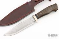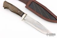 This Hunter by Marin Soóš features a San Mai blade with 9XC carbon steel core and stainless steel cladding, false top edge, .160" blade stock and 1.362" blade depth, hidden tang construction. The handle has a nickel silver and copper guard, stabilized bog oak grip, buffalo horn and copper spacers, nickel silver and copper butt. Comes with a COA and a brown leather sheath with ostrich leg skin inlay. New from maker.