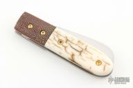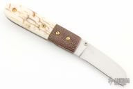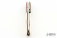 This linerlock by Tony Miller features a hand rub satin finished blade with a single thumbstud. The handle has stippled copper bolsters, mammoth ivory scales, gold plated screws, titanium liners, black paper micarta backspacer. Nice lockup and blade seating. Comes with a zippered case. Excellent condition.