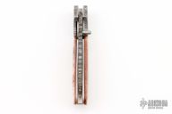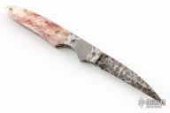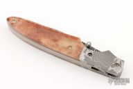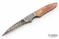 This linerlock folding dagger by Frank J Dilluvio features a Mosaic Damascus blade with a single thumbstud with diamond inlay. The handle has dovetailed Mosaic Damascus bolsters, dyed giraffe bone scales, titanium liners and backspacer. Nice detent, lockup and blade seating. Dated 2006. Comes with a zippered case. Has a couple light scratches, otherwise excellent condition.