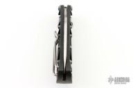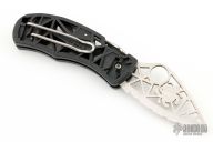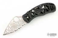 This Q Knife front-lock folder by Spyderco has a skeletonized satin finished stainless steel fully serrated blade with unique, clip-style front lock. Handle is black skeletonized polymer with 4-way reversible clip and lanyard hole. Comes with original box. Excellent condition.