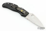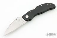 This Spyderco Calypso Jr. is a discontinued model with a satin finished blade with a fully serrated edge and black micarta handle. Includes original box. Has a few light scratches, otherwise excellent Comes with original box.