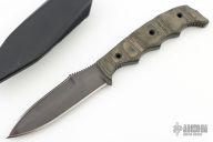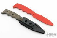 This Dynamis Alliance fixed blade was crafted by Daniel Winkler. IT features a spear point blade with sharpened top edge and notched thumbrest. The handle is comprised of sculpted black canvas micarta scales over full tang construction. Jimping on pommel provides purchase when holding in the reverse grip. Includes a molded plastic sheath with metal clip. Includes red anodized aluminum trainer. Excellent condition.