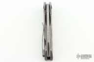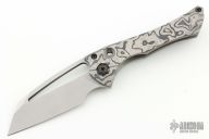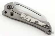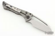 This Custom Nurse flipper by Gavko Knives features a stonewash finished blade with textured spine and a thumbhole. The handle has a black timascus and blasted titanium frame with a black timascus tip up clip, black pivot and screws. Rides on bearings, nice detent, lockup and blade seating. Comes with a zippered case. Excellent condition.