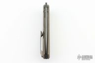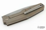 This framelock was designed by Philippe Jourget and manufactured by CKF. This knife features an acid etched finished drop point blade with a notched thumb rest. The handle has a groot finished titanium frame with a titanium backspacer and tip up pocket clip.  Includes a COA and a padded zippered case.  S/N 254. Dated 08/21.  Has been customized by Serpant Run Customs.Excellent Condition.