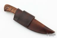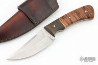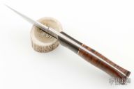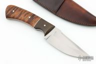 This Taranator by Shawn Hatcher features a satin finished blade with false top edge, fullers .156" blade stock and 1.375" blade depth, full tapered tang construction. The handle has micarta bolsters, koa wood scales with brown G-10 liners. Comes with a brown leather sheath.  Excellent Condition.