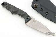 This Muninn EDC by Bawidamann Blades was named after Odin’s Raven. It features a stonewash finish on the blade, has notched thumbrest, .101" blade stock and 1.108" blade depth, full tang construction. The handle has IM Bawidamann Chunked Pattern Carbon Fiber scales (proprietary Carbon fiber composite). Comes with a kydex sheath. Has some sheath marks, otherwise excellent condition.