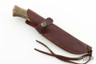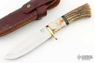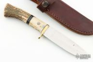 This hunter by Pabu Knives features a satin finished blade with .127" blade stock and 1.190" blade depth, hidden tang construction. The handle has a brass guard, stag grip with black/white spacers and abalone inlays, has notches on the top and bottom of handle behind the guard. Comes with a brown leather sheath. Has some scraches and an oxidation spot on the blade, otherwise good condition.
