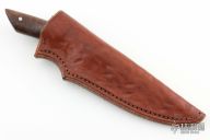 This knife by Chris Peterson features a Damascus blade with visible temper line, fileworked spine, .256" blade stock and 1.632" blade depth, full tapered tang construction. The handle has nickel sivler bolsters, fiddleback maple scales with red liners. Comes with a brown leather sheath. Has some patina, otherwise excellent condition.