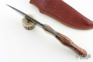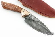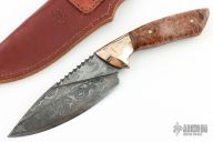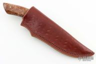 This knife by Chris Peterson features a Damascus blade with visible temper line, fileworked spine, .245" blade stock and 2" blade depth, full tapered tang construction. The handle has mokume bolsters, maple burl scales with red liners. Comes with a brown leather sheath. Has some patina, otherwise excellent condition.
