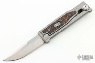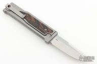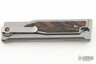 EXO Mini Gravity knife. Drop point blade, titanium handle, Orange/Black G10 Damascus Pattern inlays. Comes with original box, and accessories. S/N 1289 dated 08/2023. New condition.