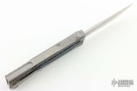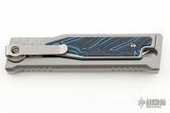EXO Mini Gravity knife. Drop Point blade, titanium handle, Blue/Black G10 Damascus Pattern inlays. Comes with original box, and accessories. S/N 1892 dated 08/2023. New condition.